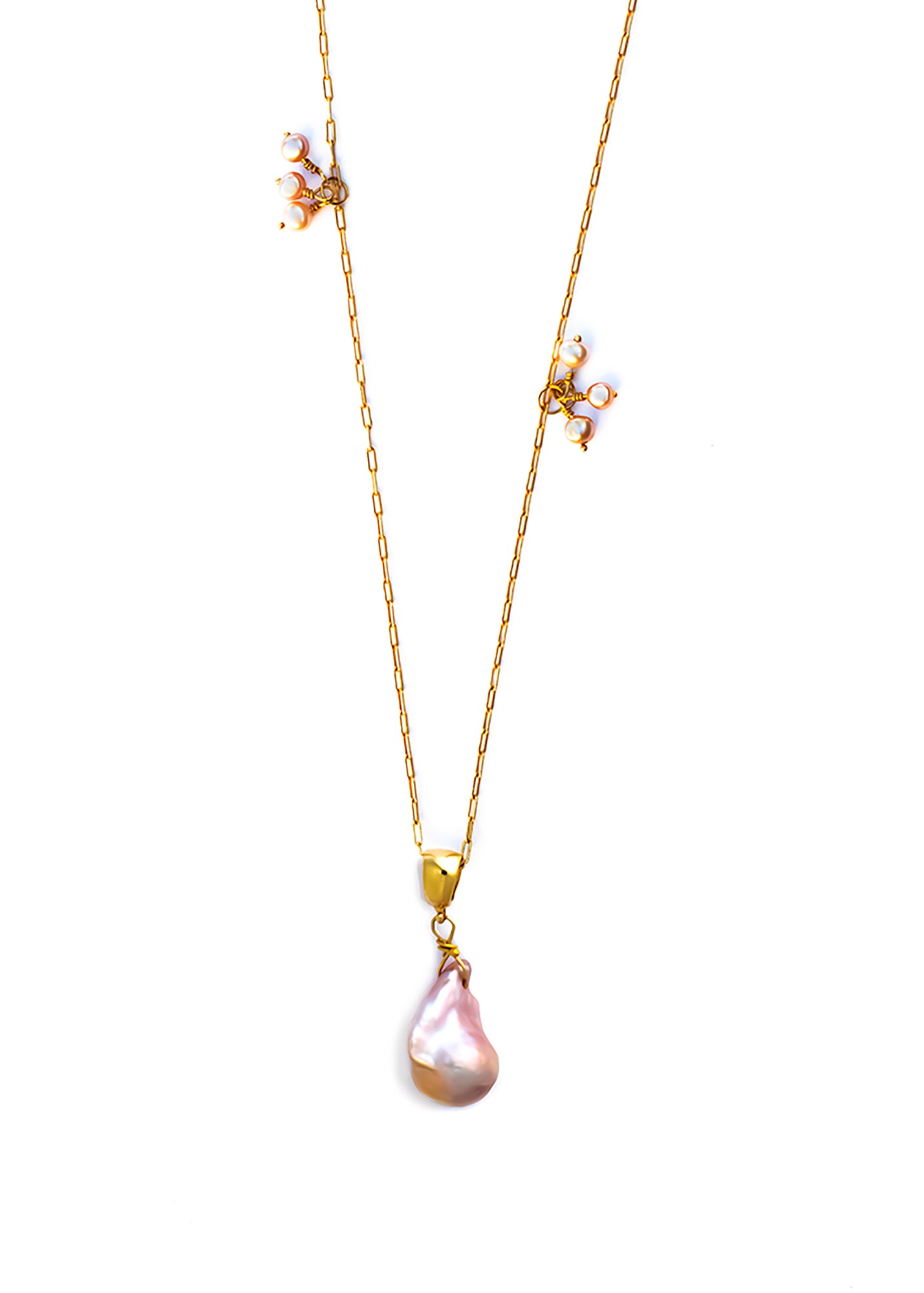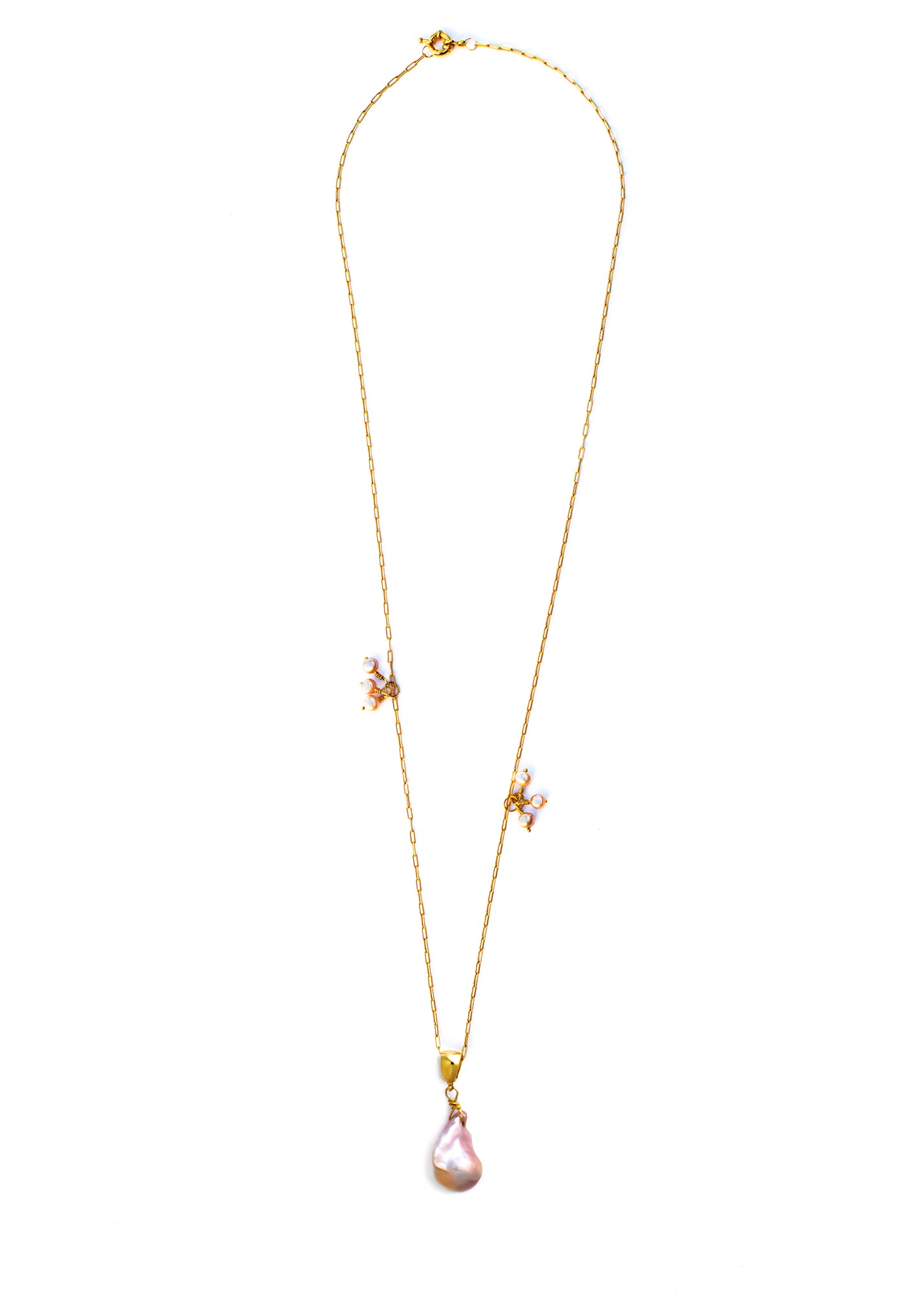 A model of peach white Baroque pearl on a sparkling 18k gold filled paperclip chain gives this necklace a playful touch. Create a vibrant look by pairing with more pearl pieces.