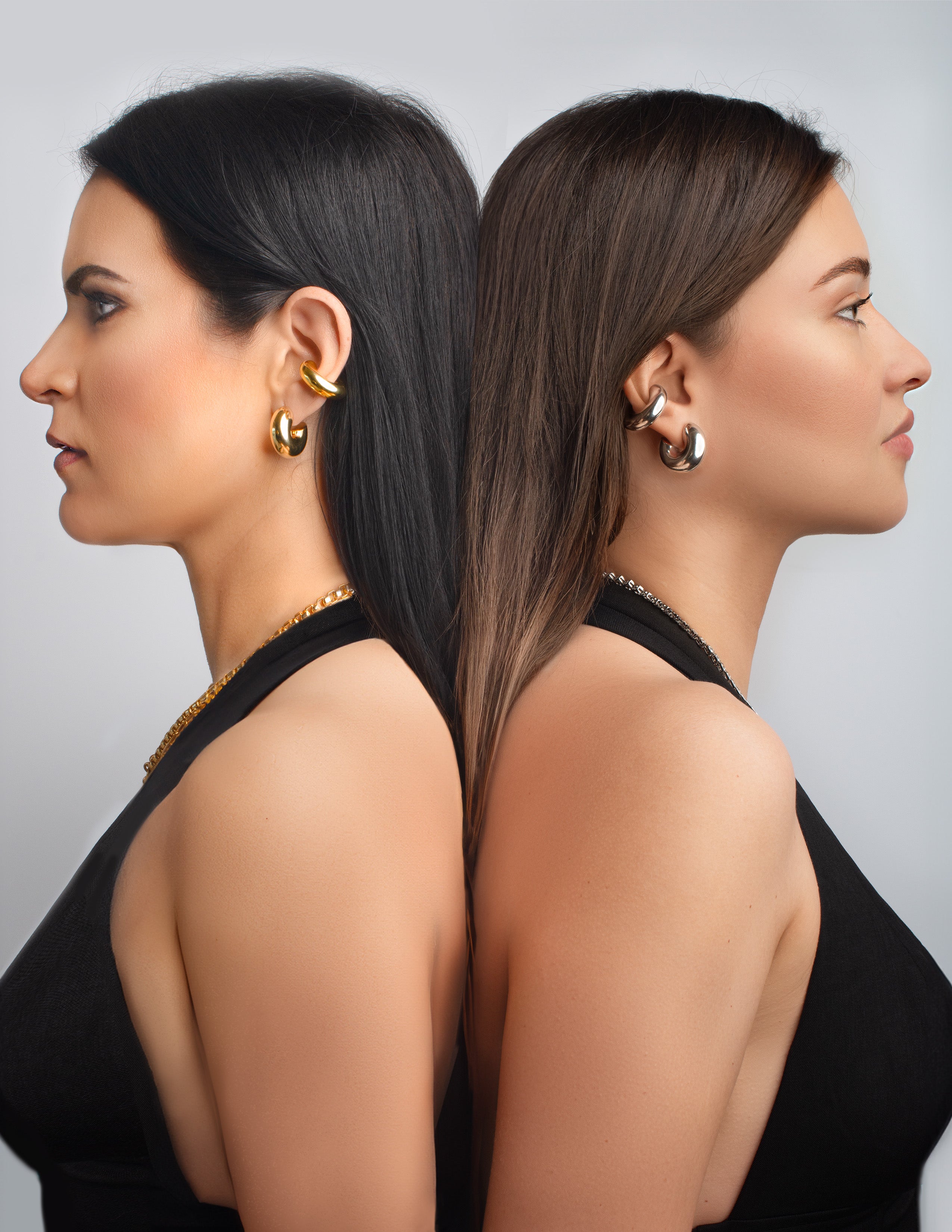 Featuring a chunky open hoop, expertly crafted in either Gold filled or Rhodium plated. Stack it up with a couple of ear cuffs and another hoop for an alluring view.