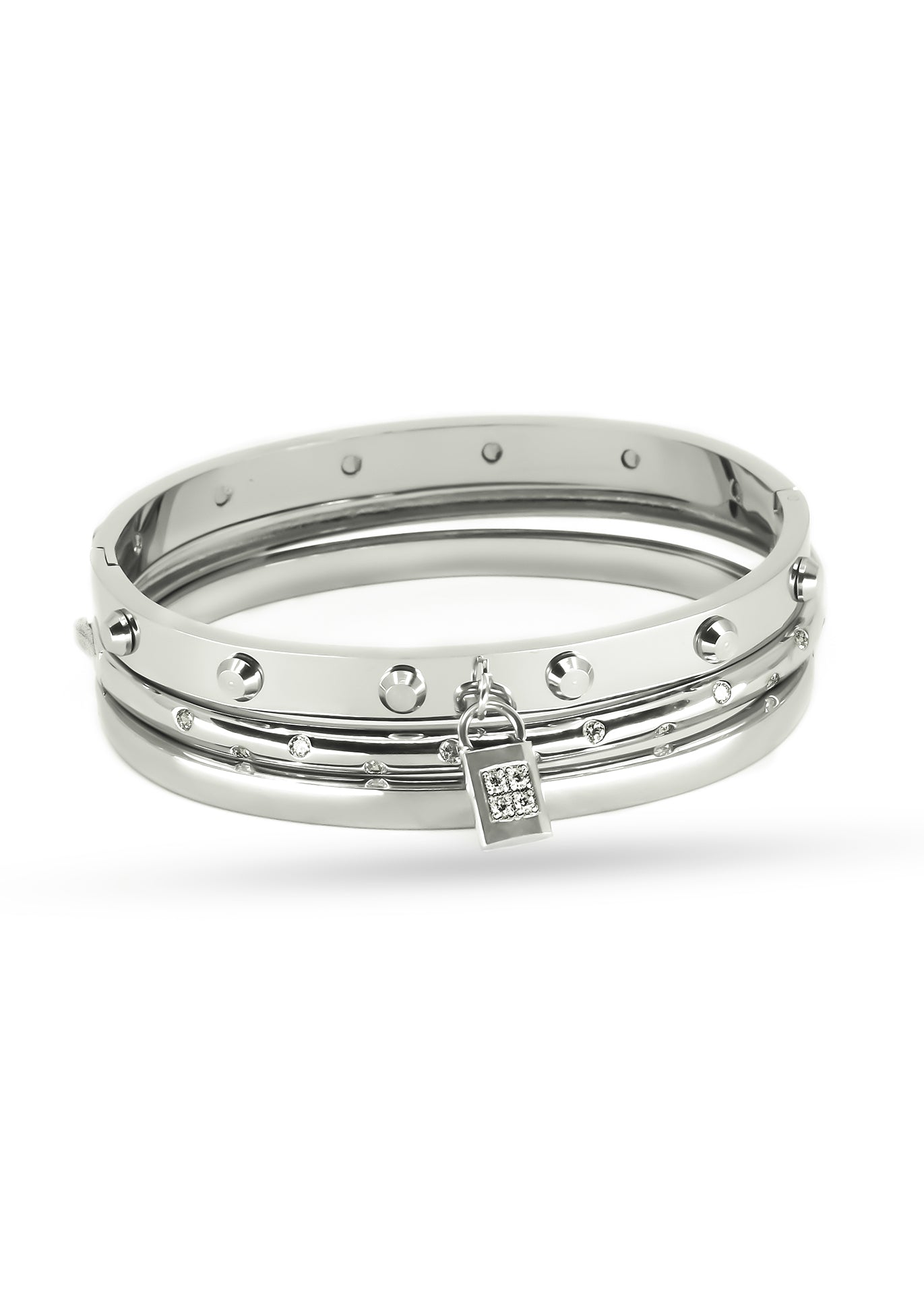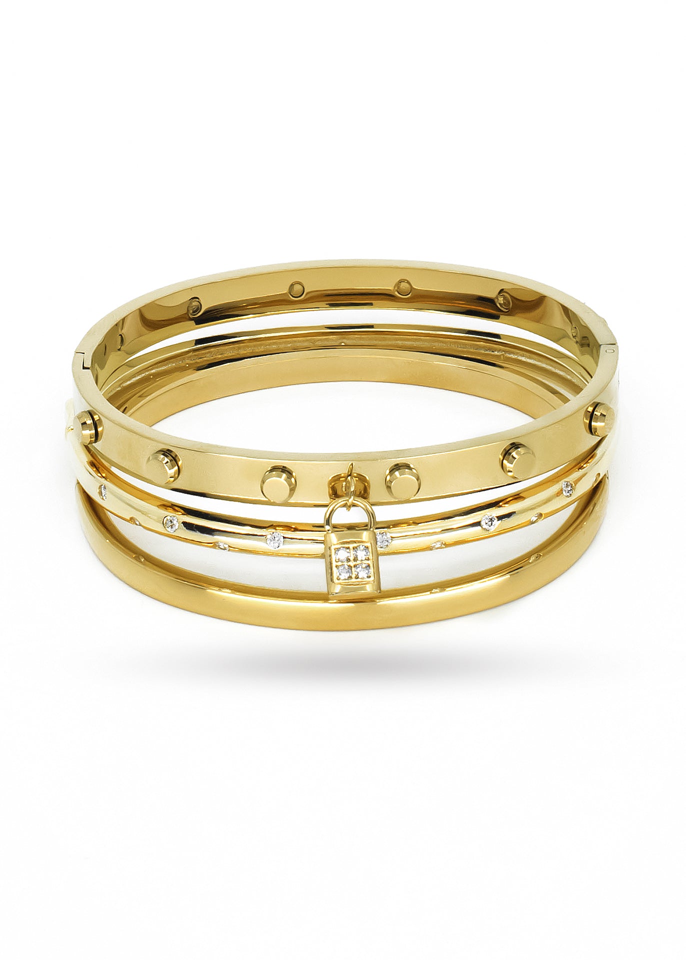 Stackable shine. Add a touch of sparkle to your wrist with this elegant and classy bracelet set. Made from 18k Gold Plated or Rhodium Plated Stainless Steel for a stunning finish.