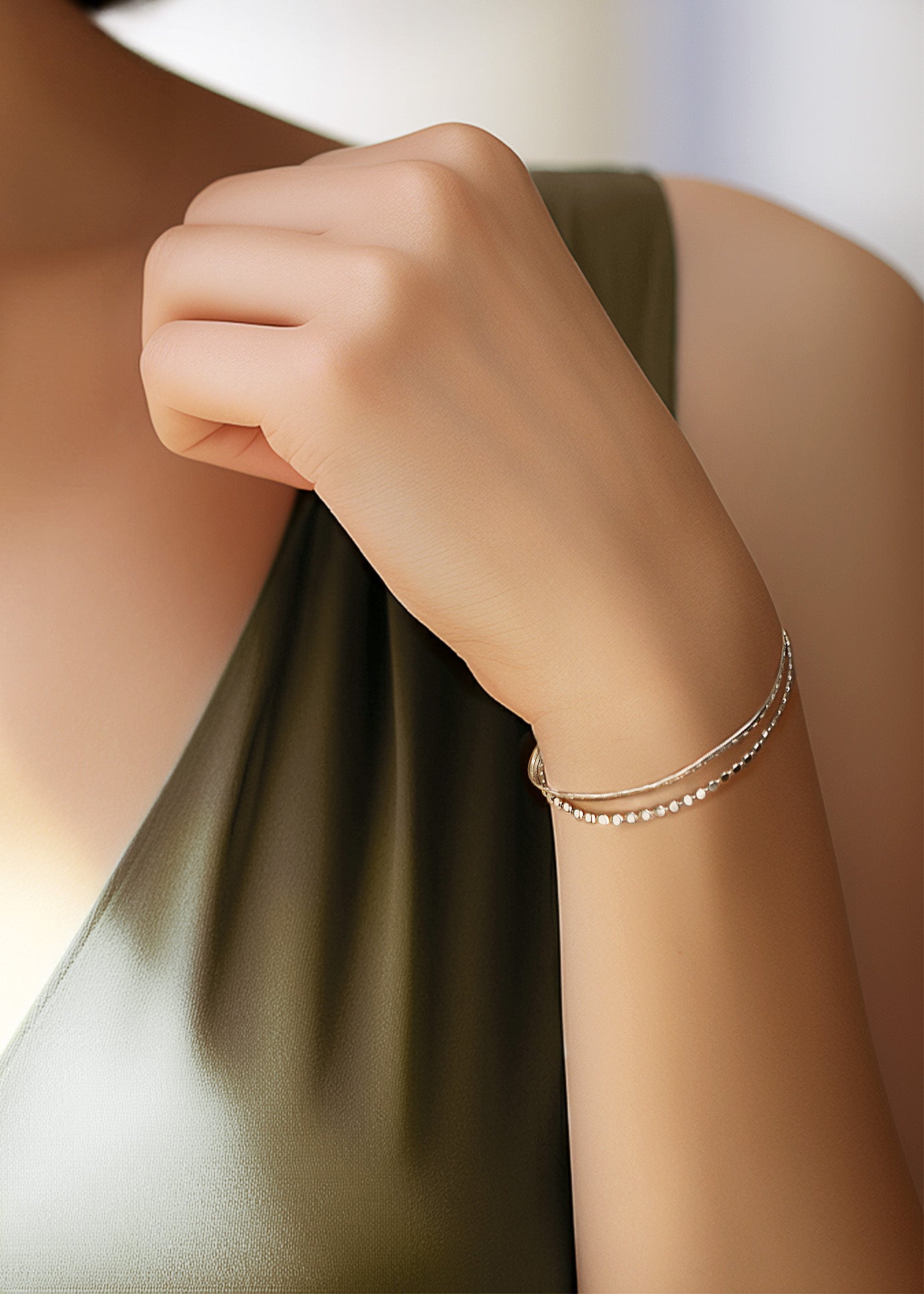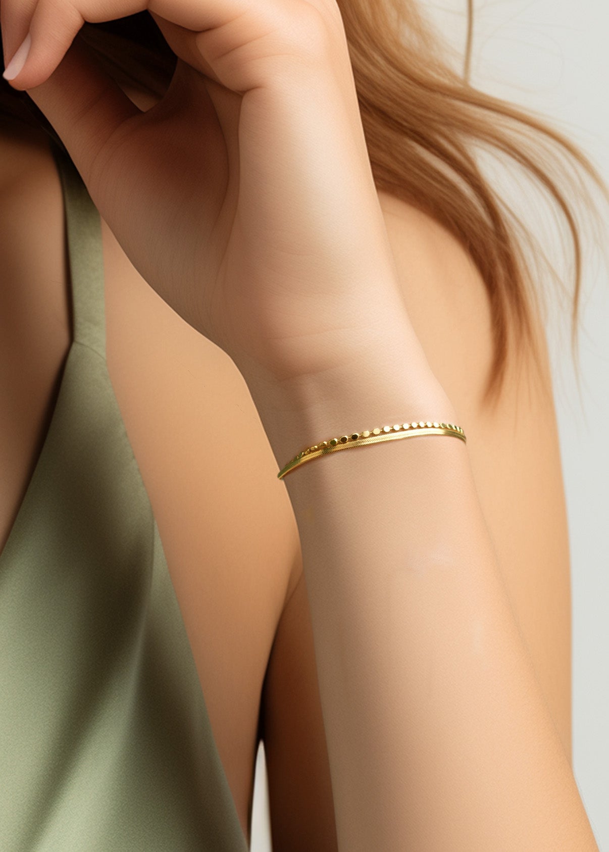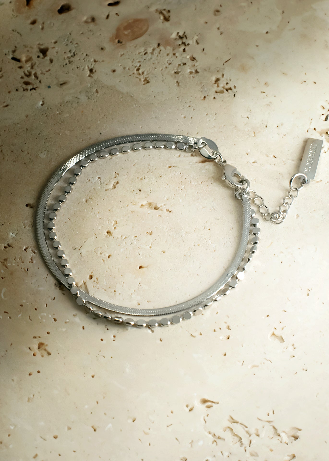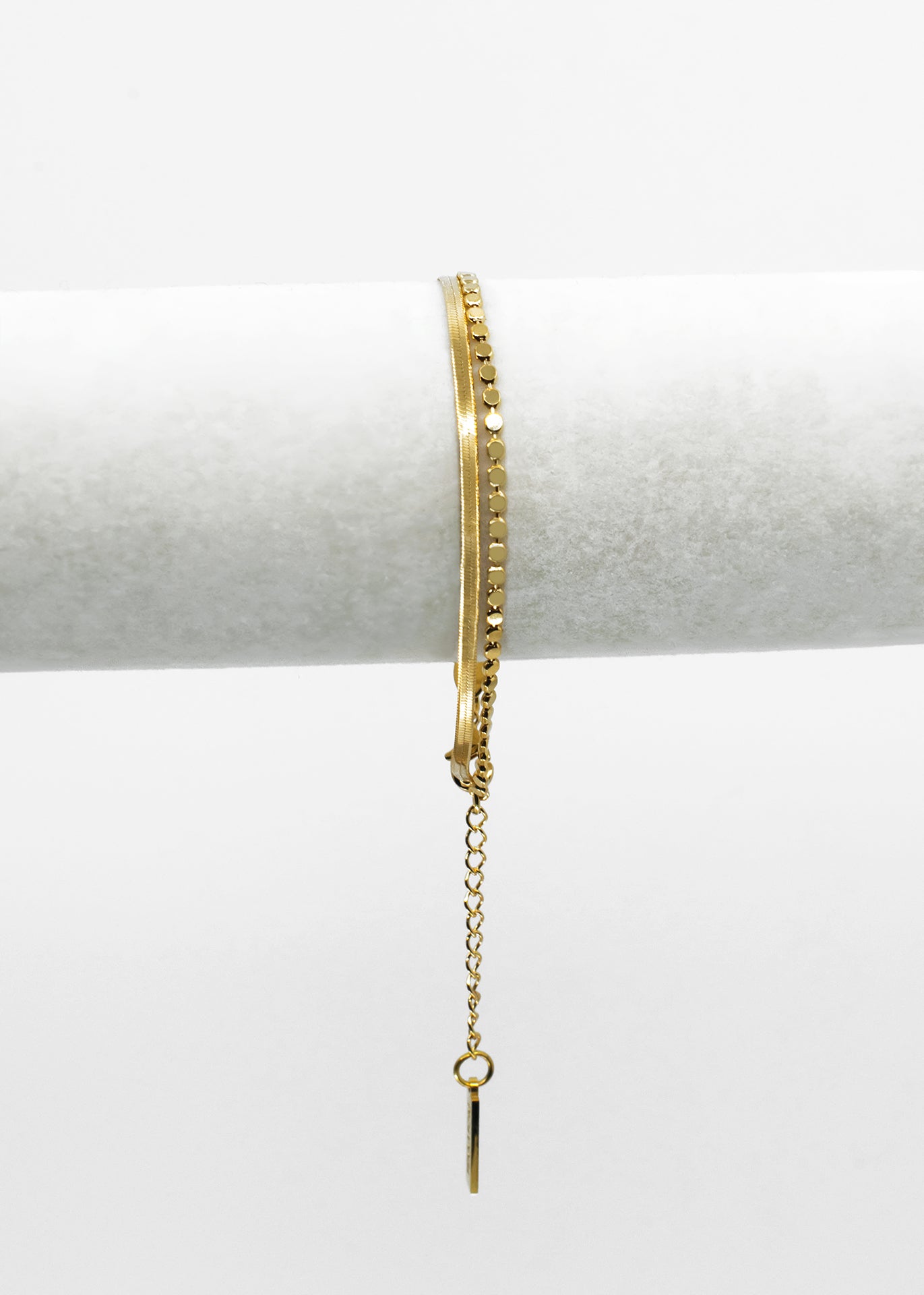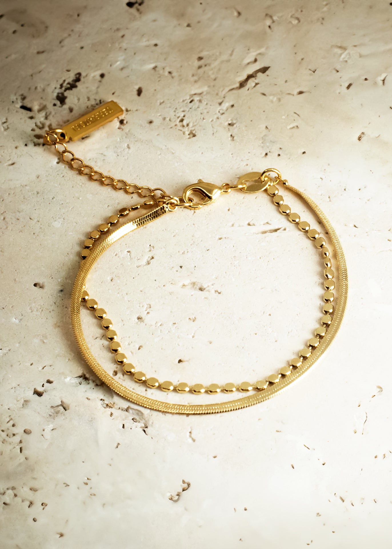 This bracelet features two dainty herringbone & disc chains, making it an effortless everyday bracelet. The most simple but gorgeous bracelet. This chain goes with anything and is the perfect addition to any stack. If you love a simple look wear it on its own.