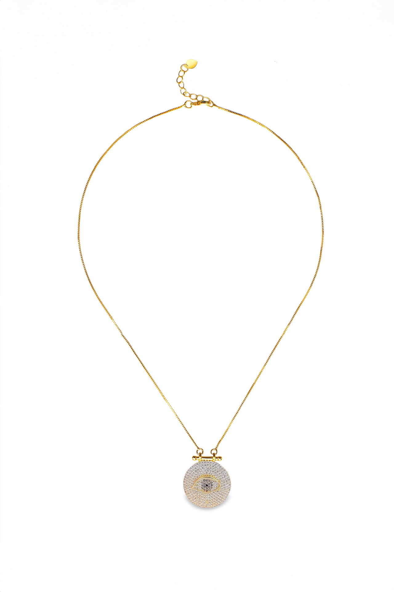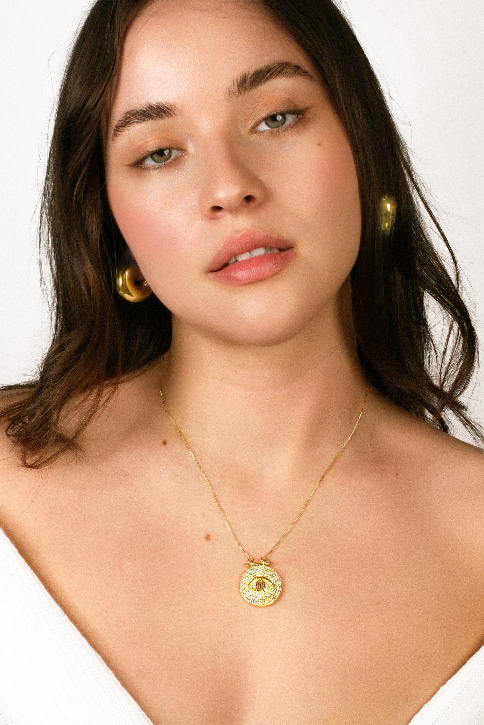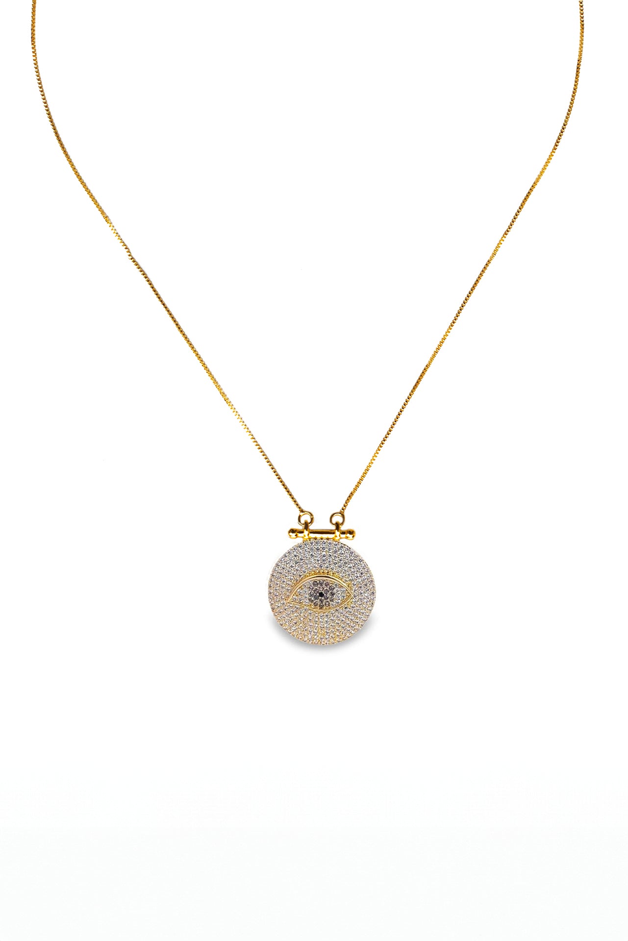 An exquisite gold medallion pendant adorned with sparkling cubic zirconias, suspended from a delicate chain necklace, combines opulence and sophistication in a timeless piece of jewelry.
