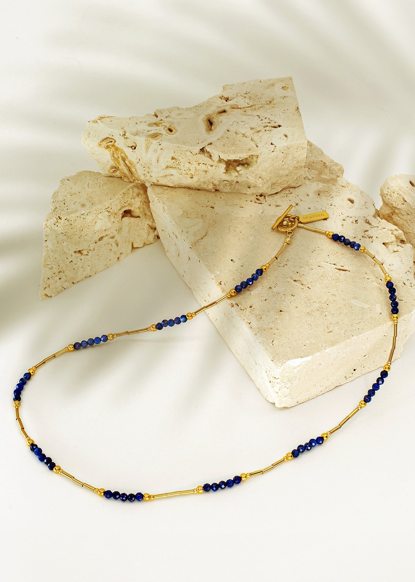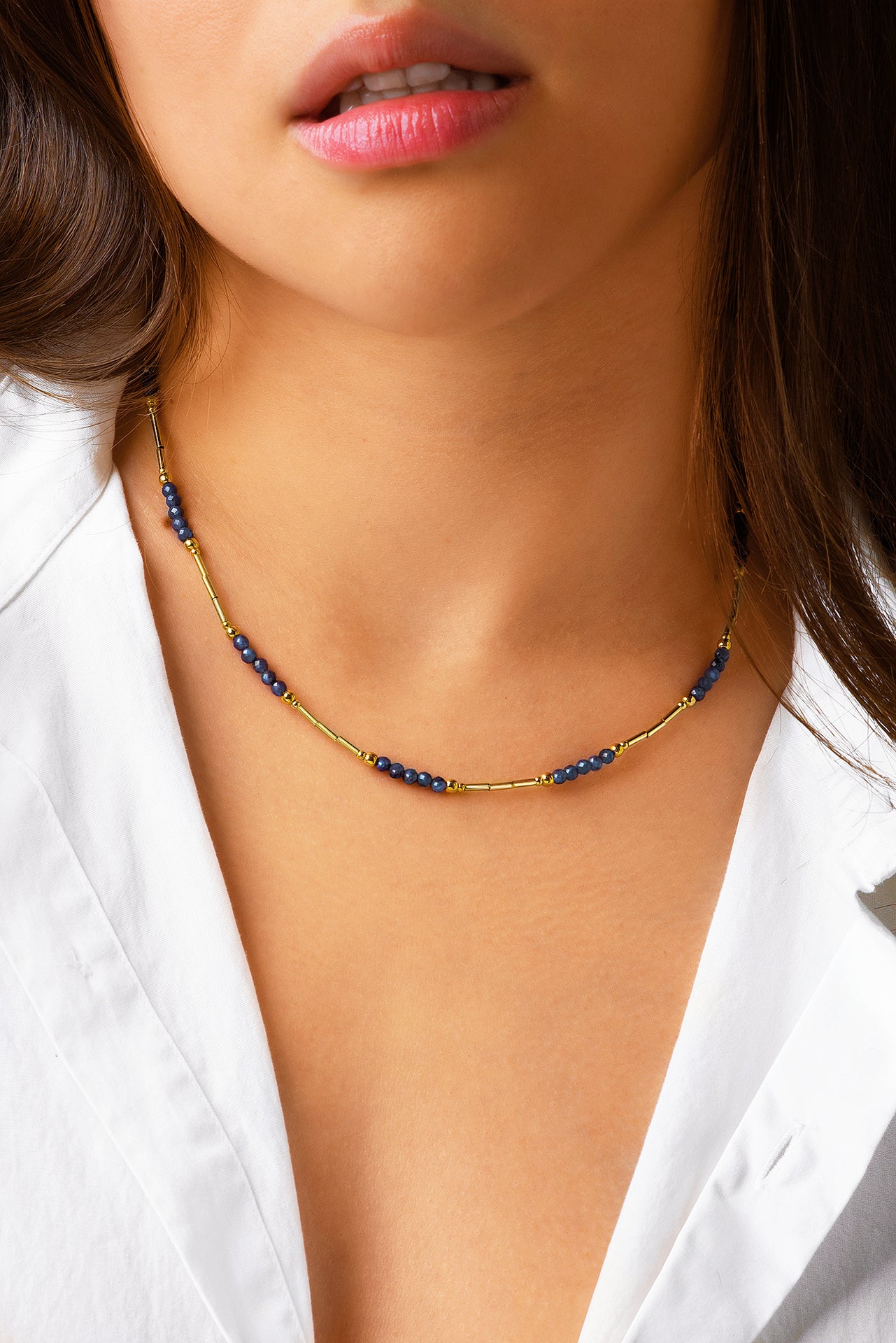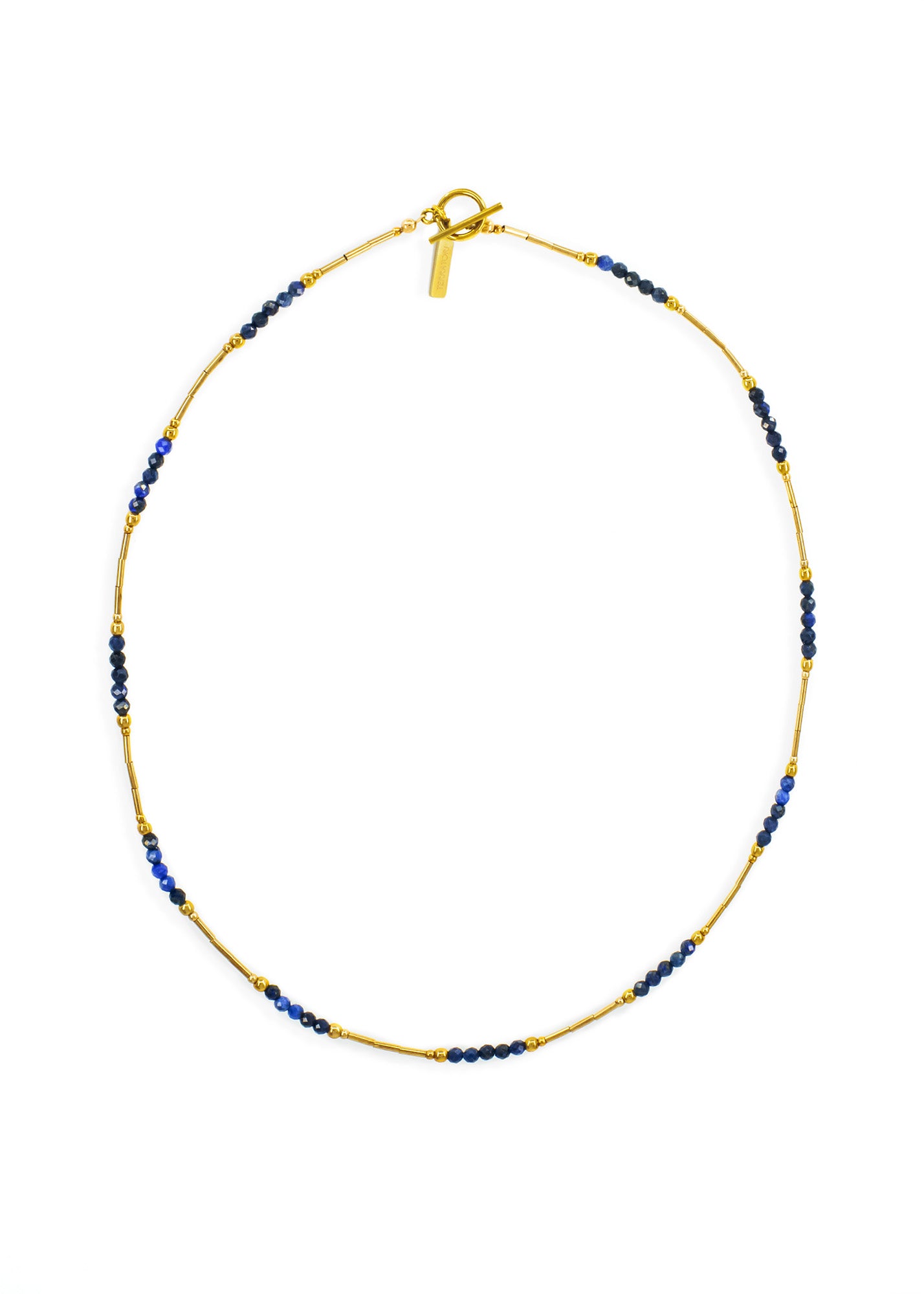 Give your outfit a colorful kick with this cool and casual necklace, featuring 3mm faceted lapis lazuli beads stationed by 18kt gold filled spacers. Natural pyrite flecks in lapis will vary.
