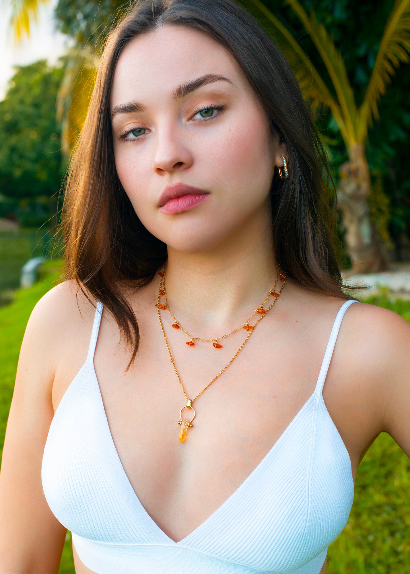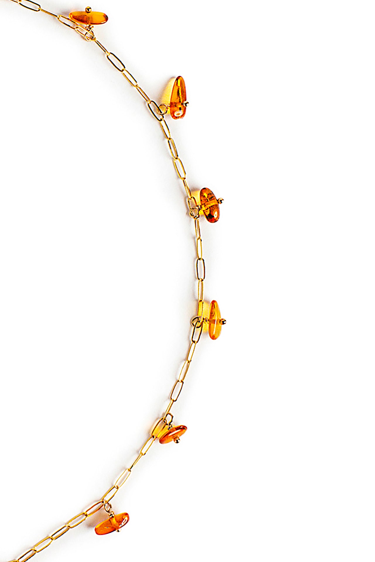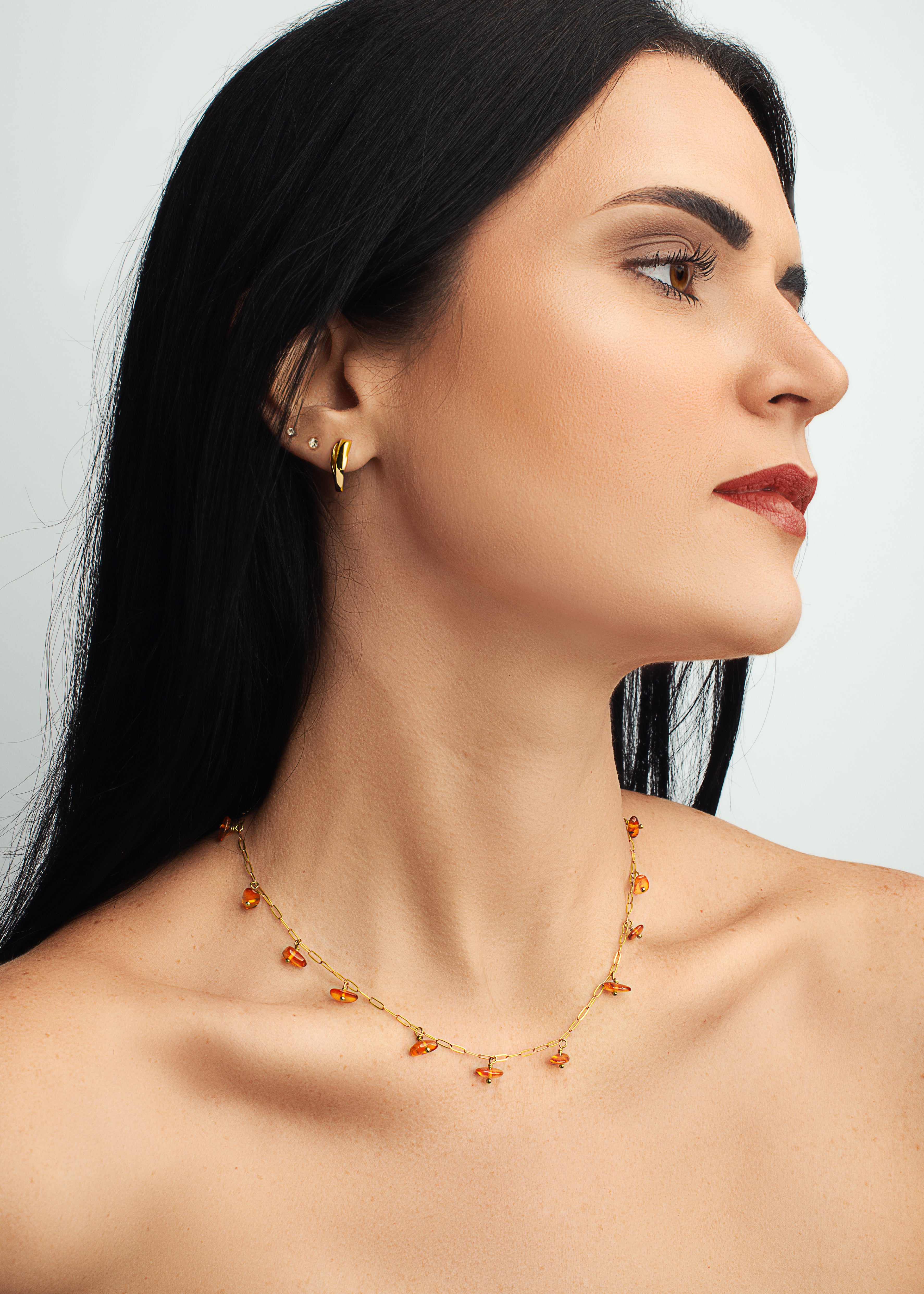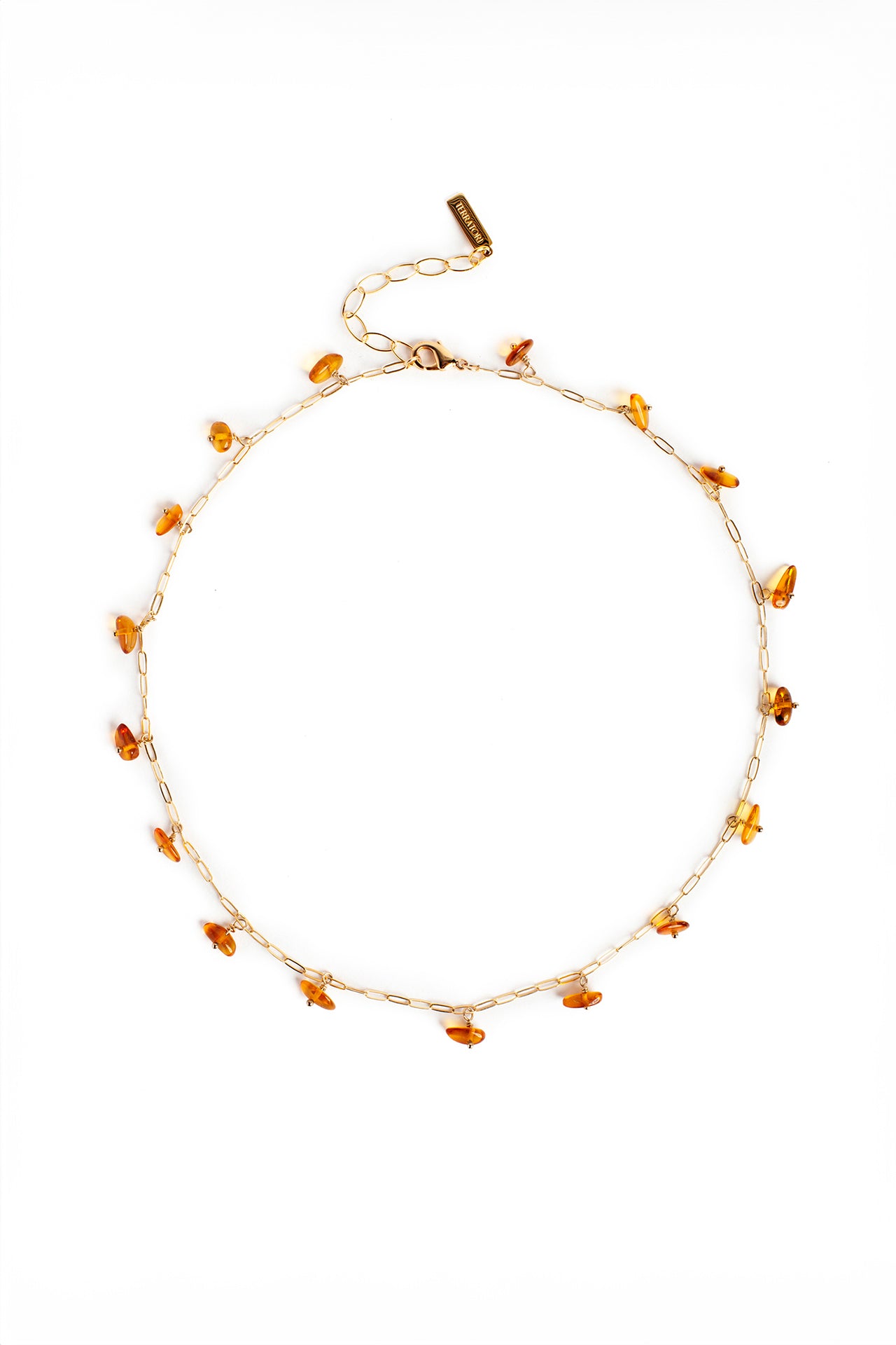 Stunning necklace adorned with dangle amber chips, each one capturing the essence of sunlight trapped within, creating a breathtaking display of warmth and elegance.