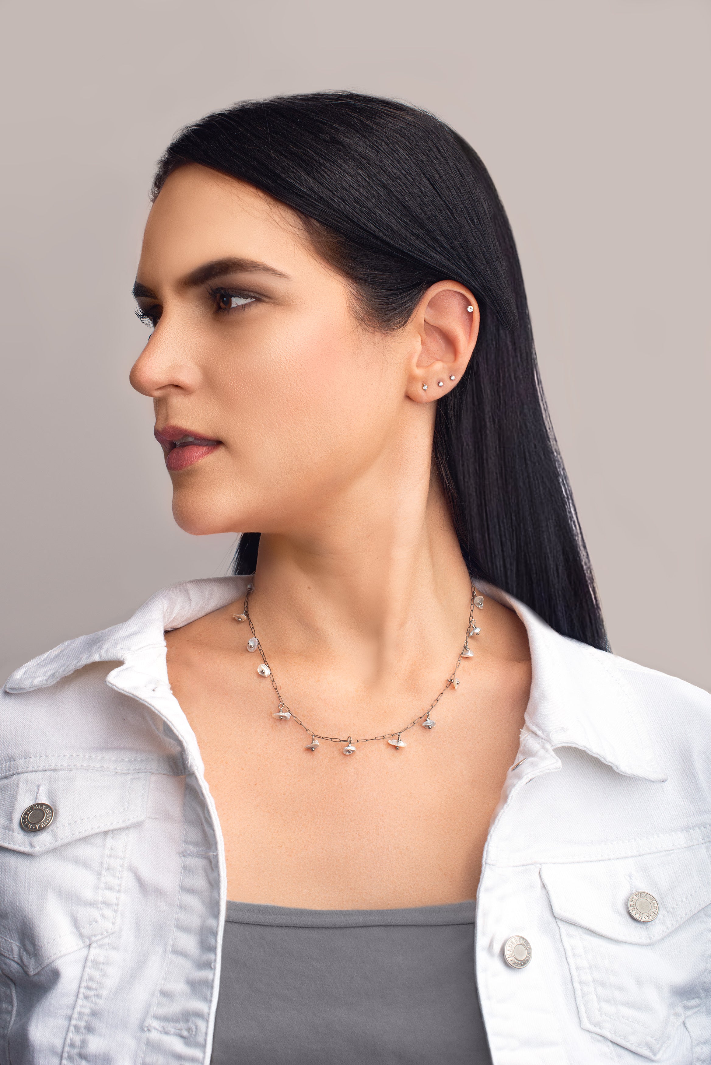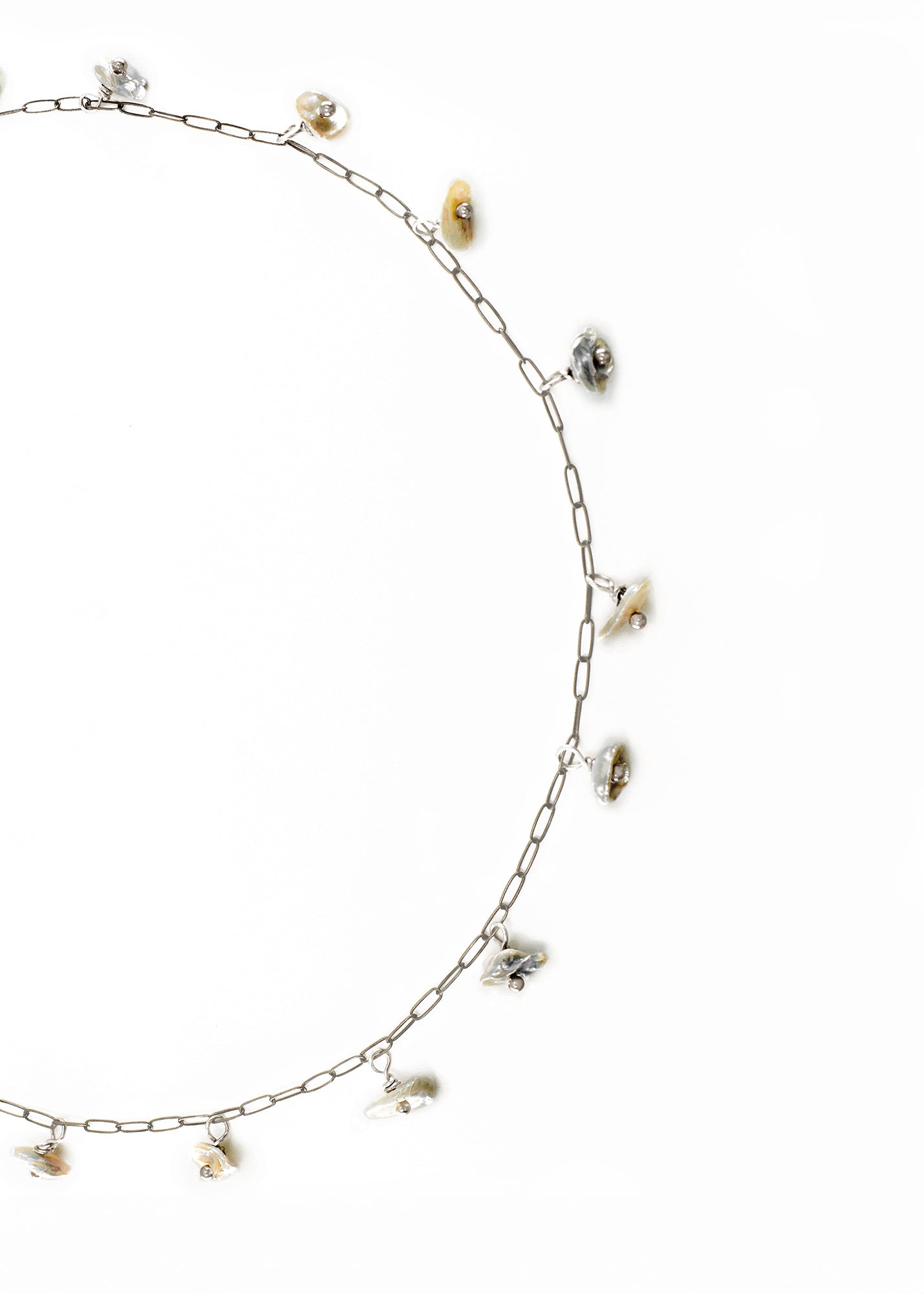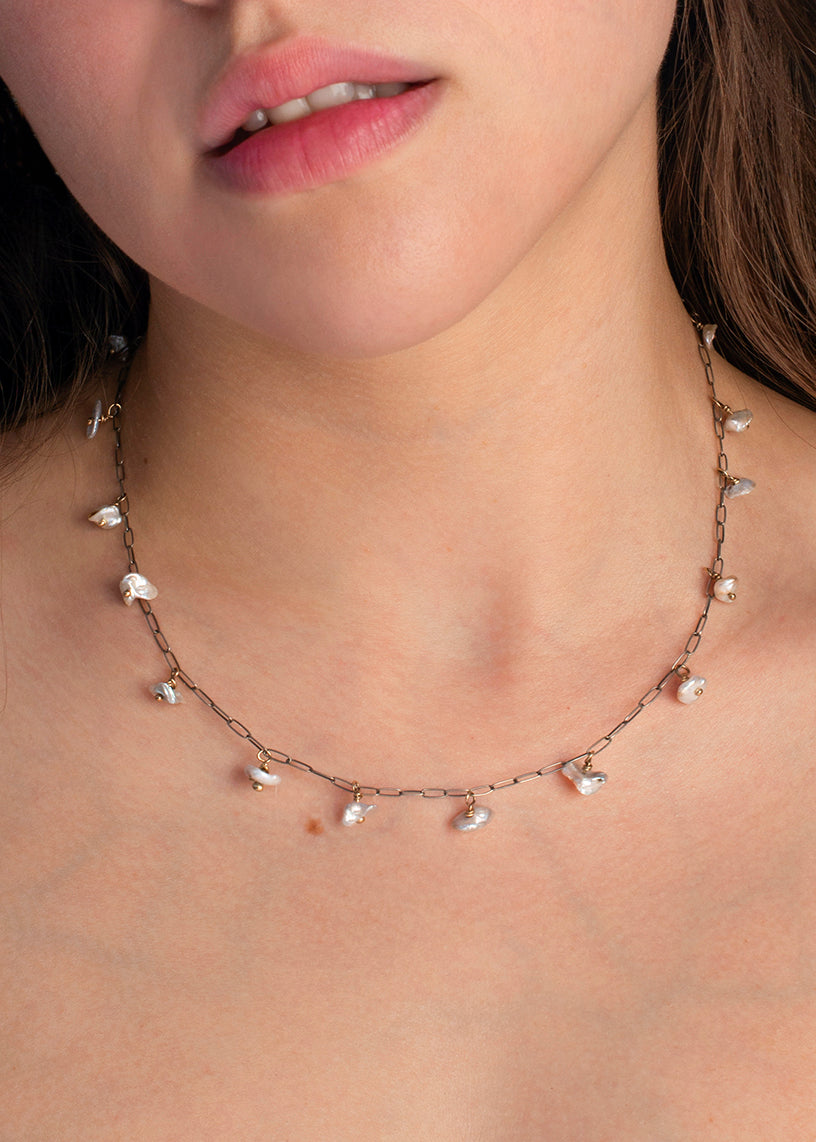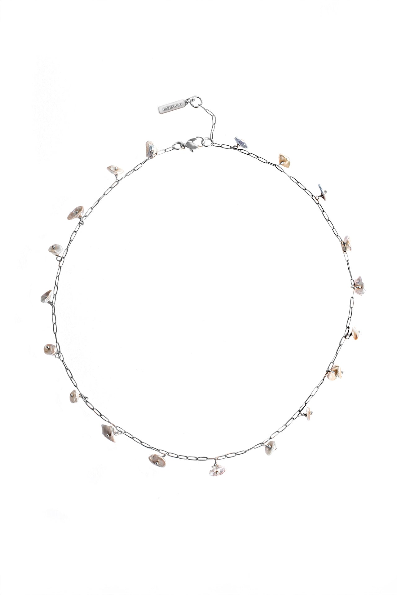 Introducing an exquisite silver chain elegantly adorned with dangling keshi pearls, imbuing a timeless touch of sophistication.
