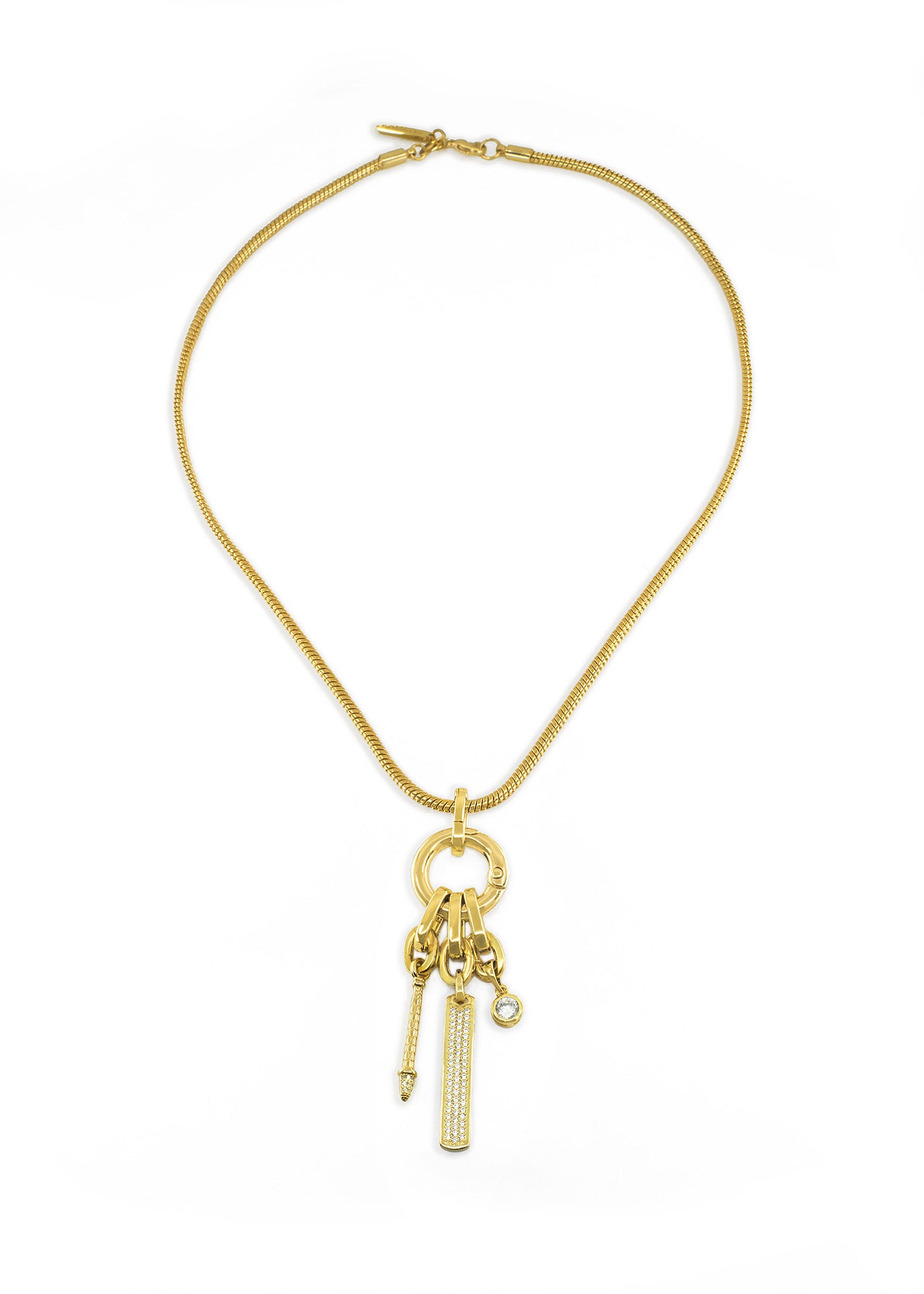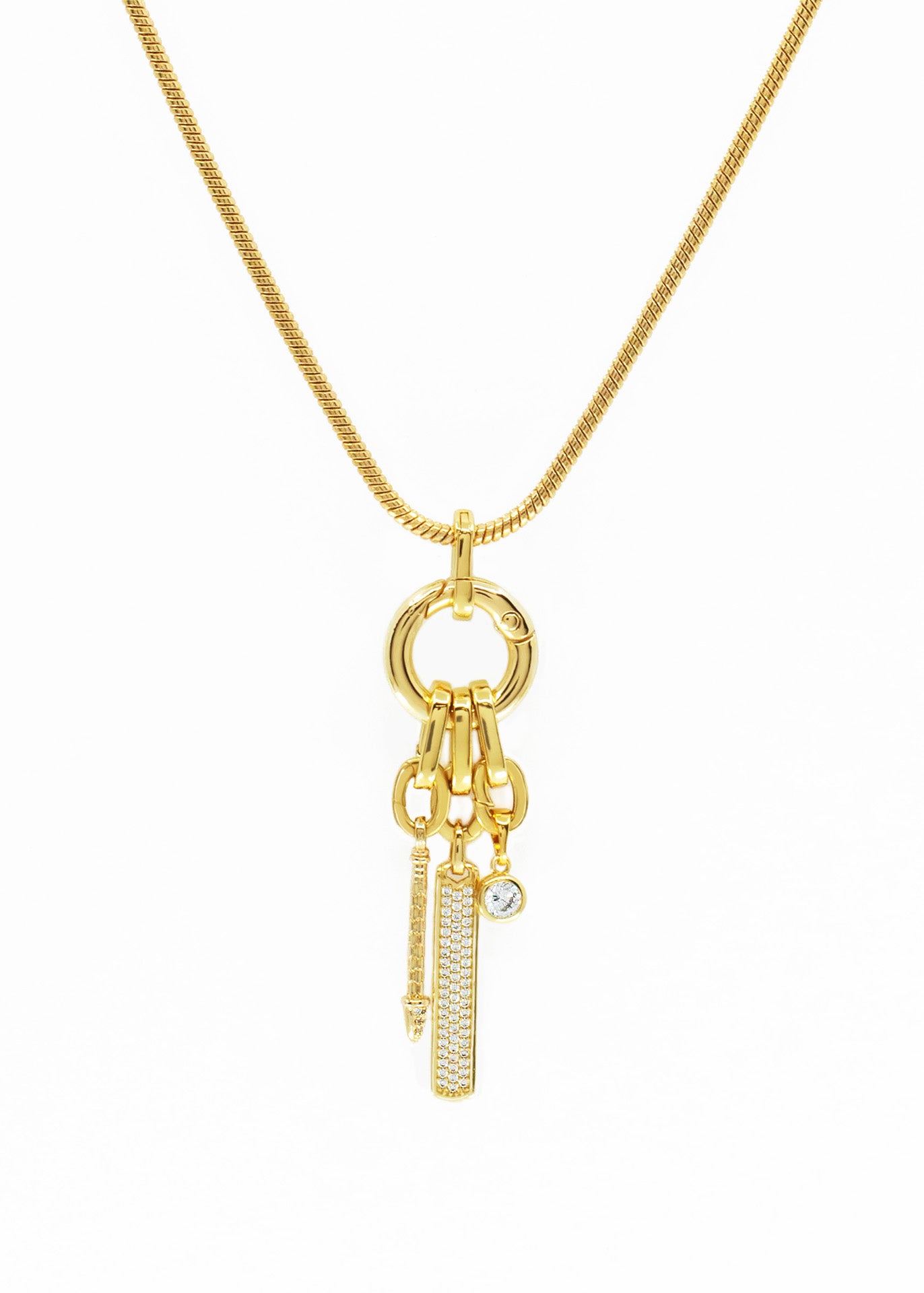This elegant gold-filled necklace showcases three exquisite pendants adorned with sparkling cubic zirconias, fastened securely with a circular push-on clasp.