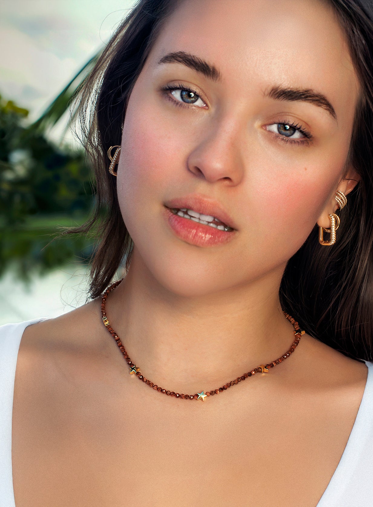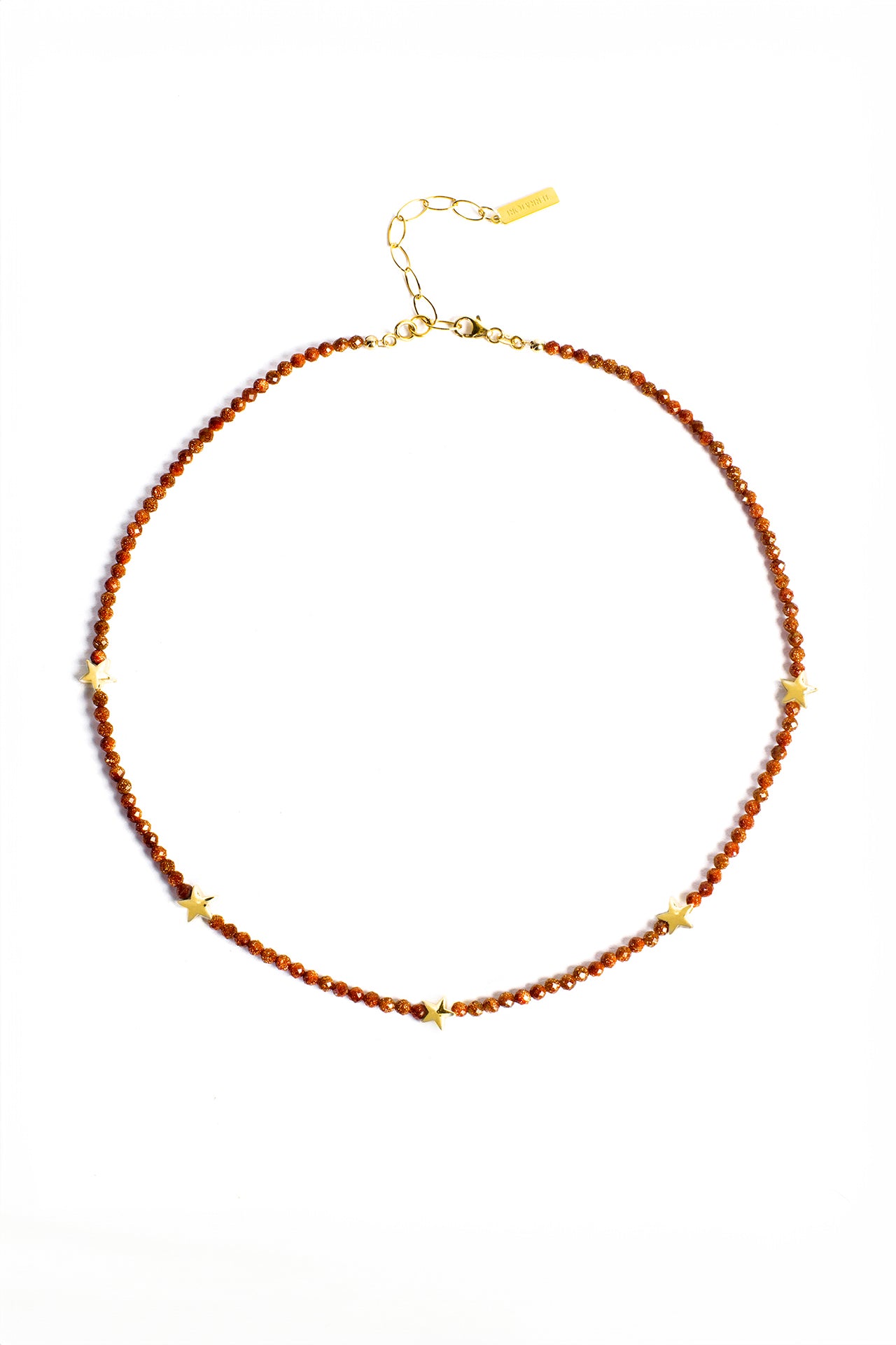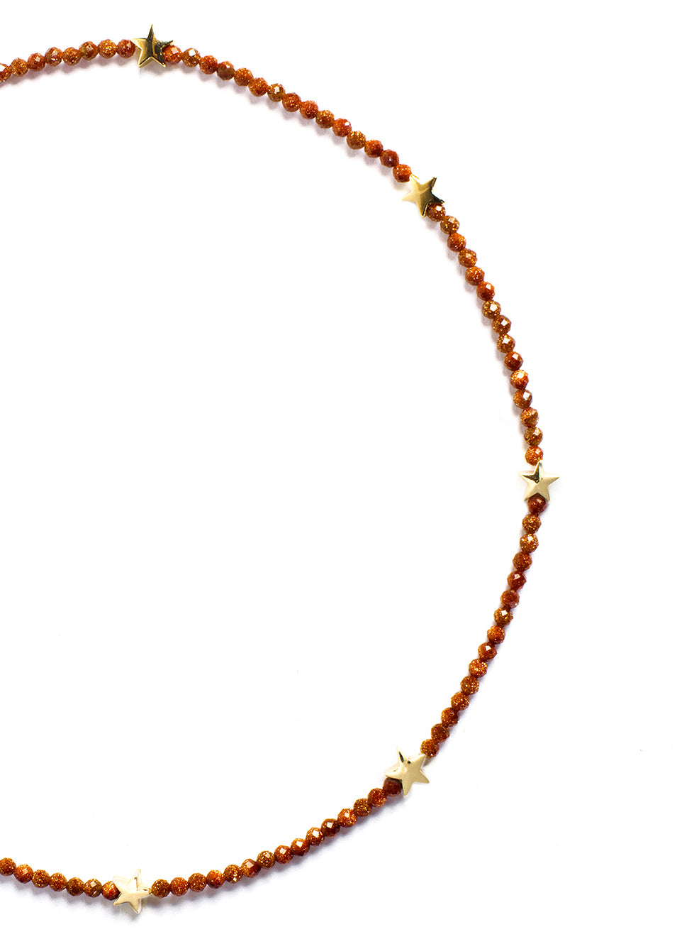 This sparkling Goldstone bead necklace is adorned with petite stars charms, combining earthy elegance with celestial allure.